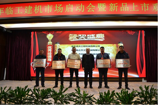 大会对2021年业绩突出的经销商进行了表彰奖励。经销商代表广西沃华工程机械有限公司总经理解桂宝、四川临沃工程机械有限公司总经理薛伟分别作了典型发言。